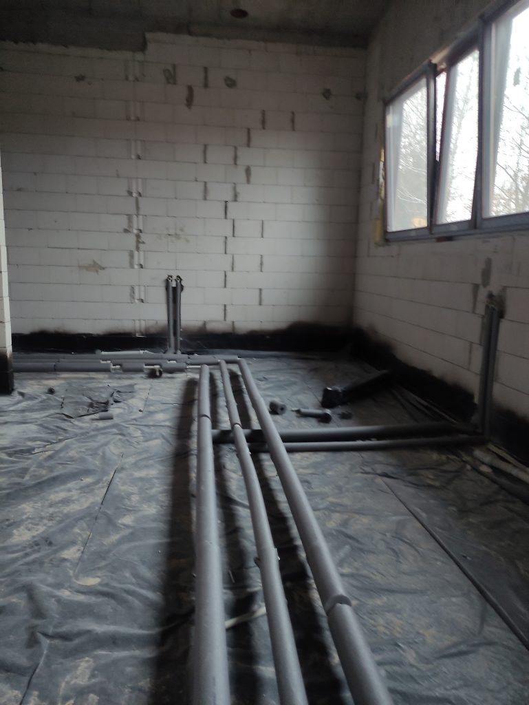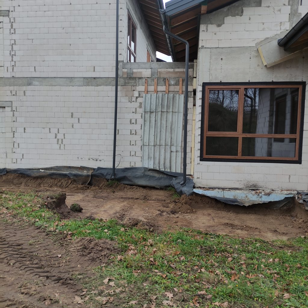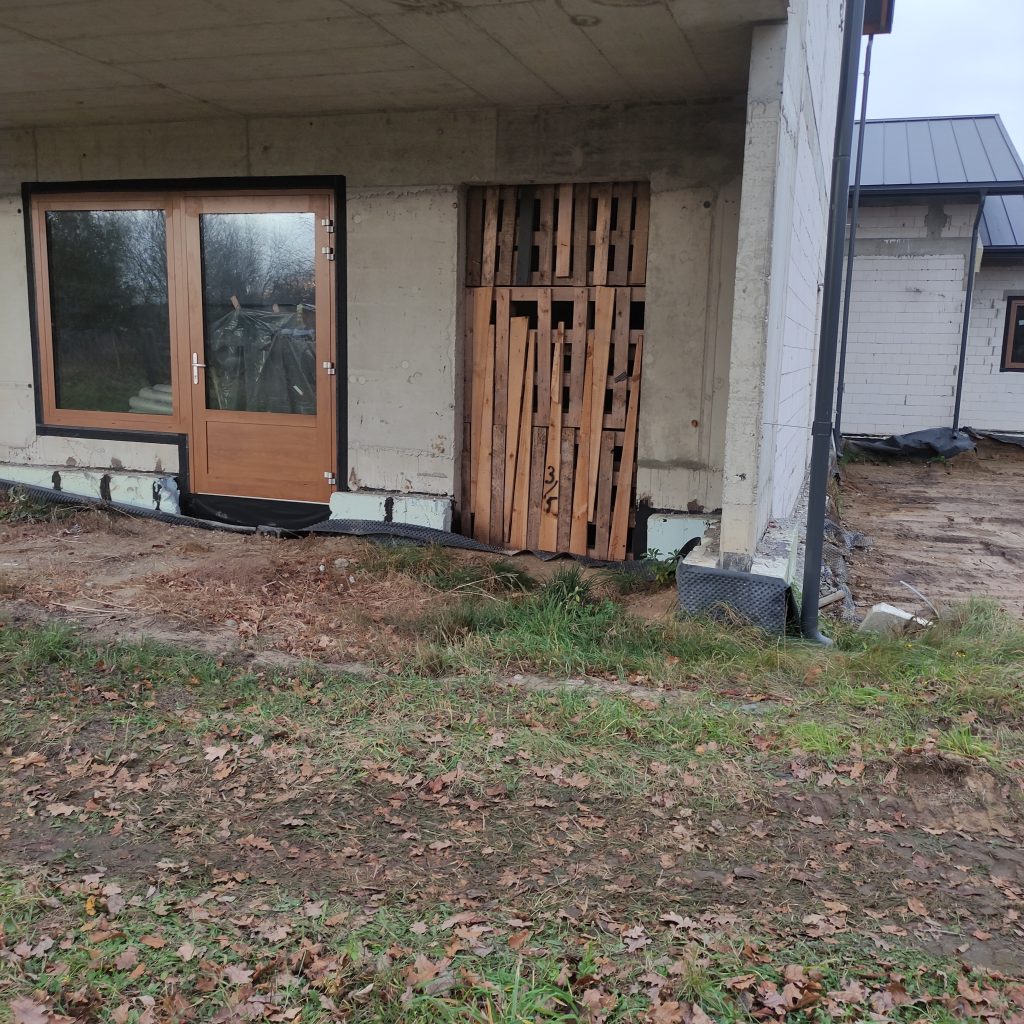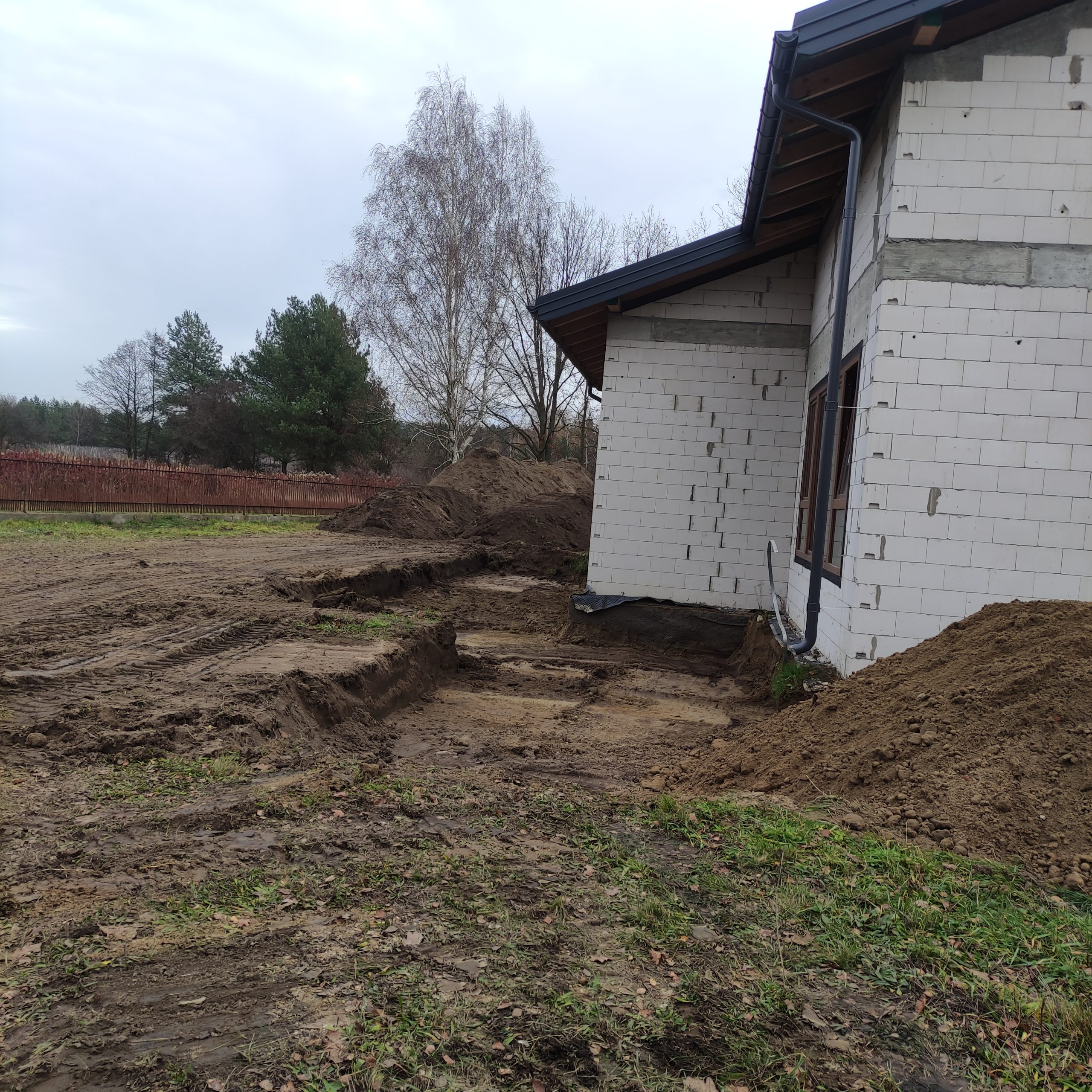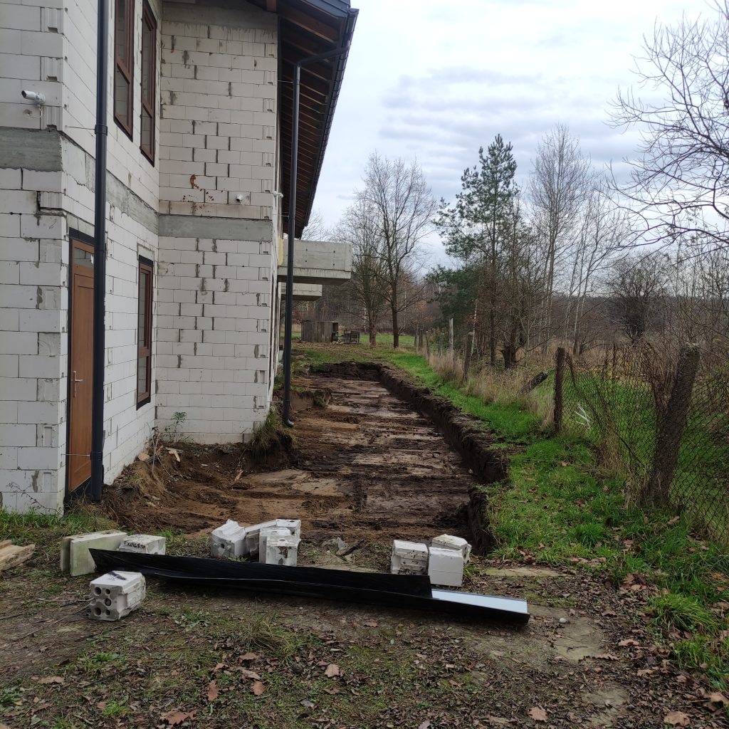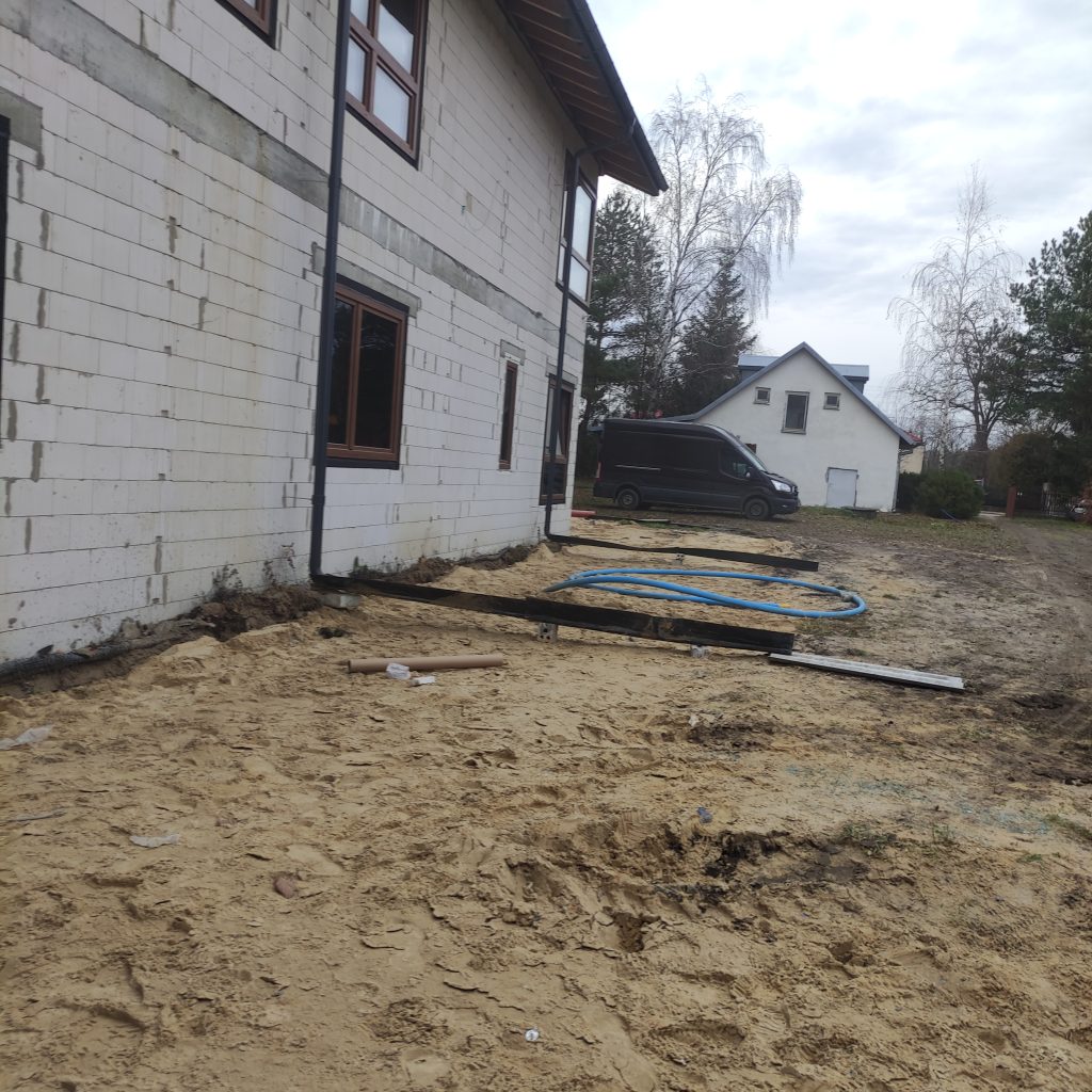 Wewnątrz budynku Panowie dalej rozprowadzają rury kanalizacyjne, kładą izolacje. Również na zewnątrz dużo się dzieje. Trwa porządkowanie gruntu. Wyrównujemy działkę, żeby zapobiec podmakaniu budynku.