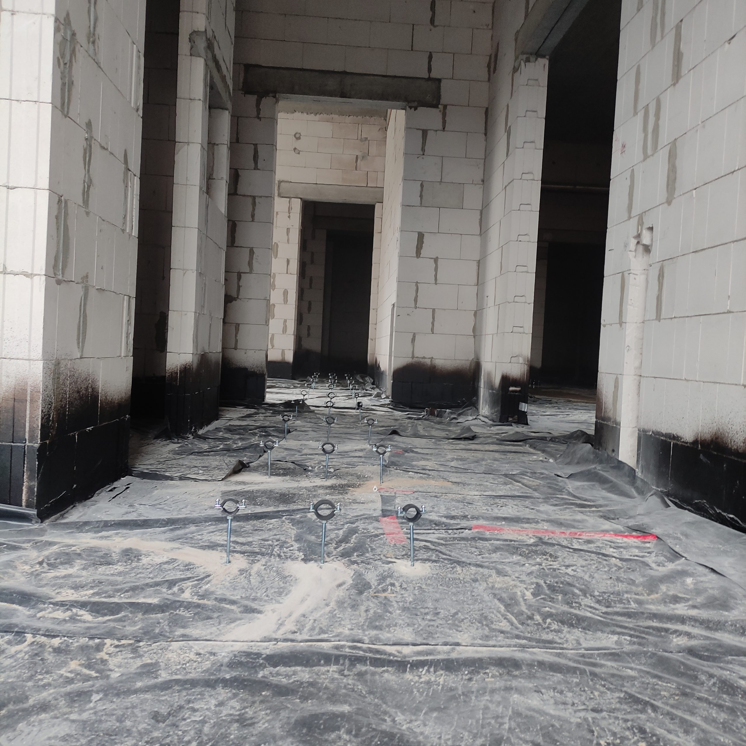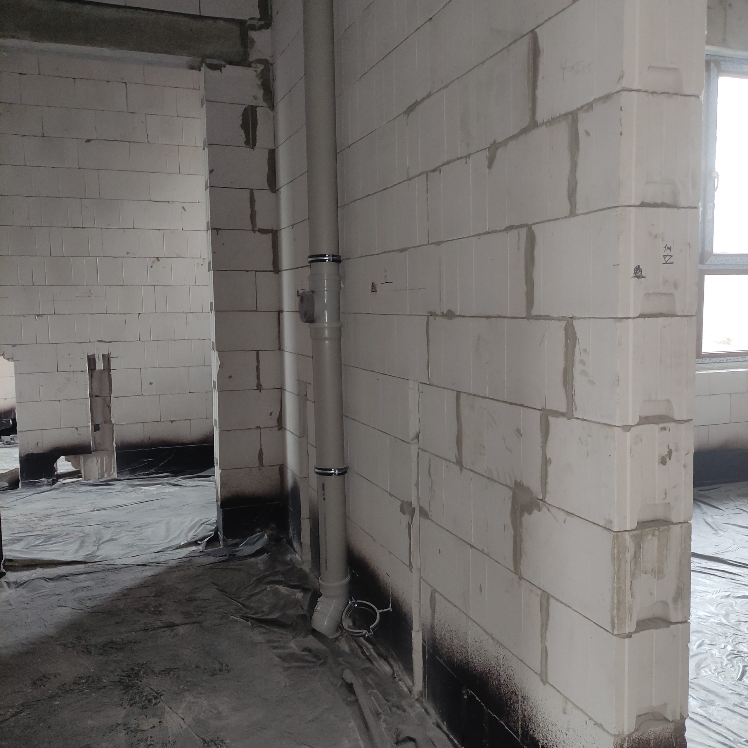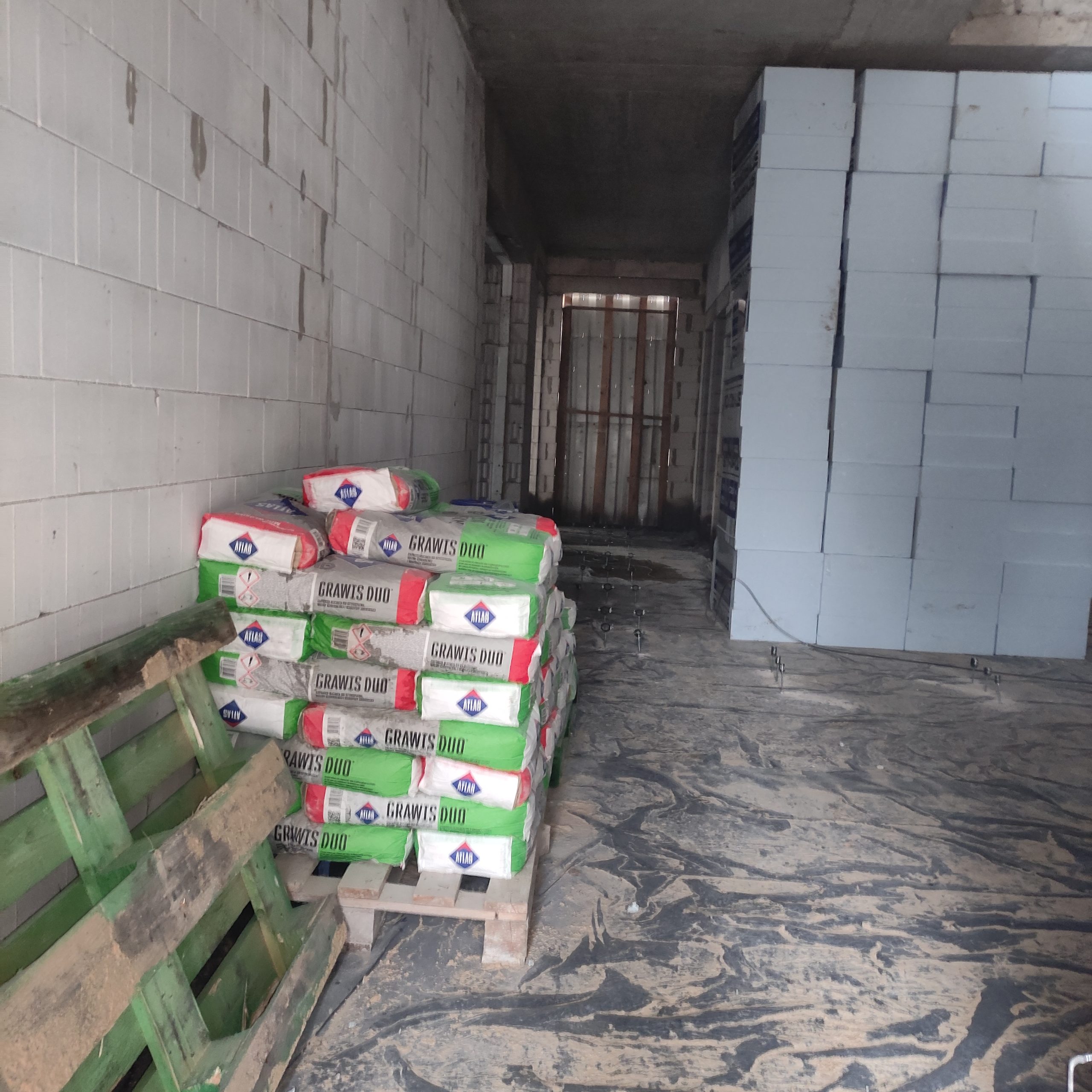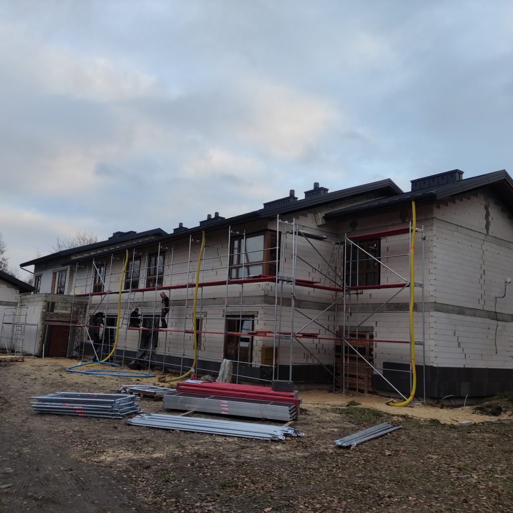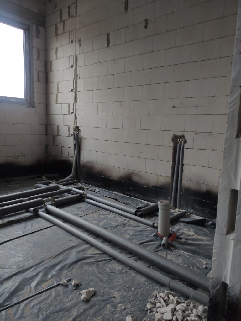 Wewnątrz budynku Panowie dalej rozprowadzają rury kanalizacyjne, kładą izolacje. Również na zewnątrz dużo się dzieje. Trwa porządkowanie gruntu. Wyrównujemy działkę, żeby zapobiec podmakaniu budynku.